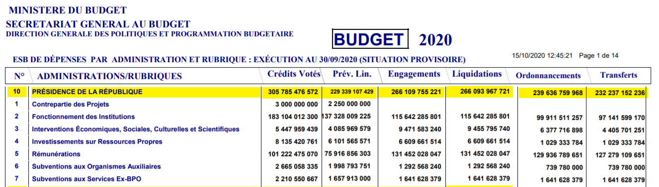 Voici les dépenses de la présidence de la République à fin septembre 2020