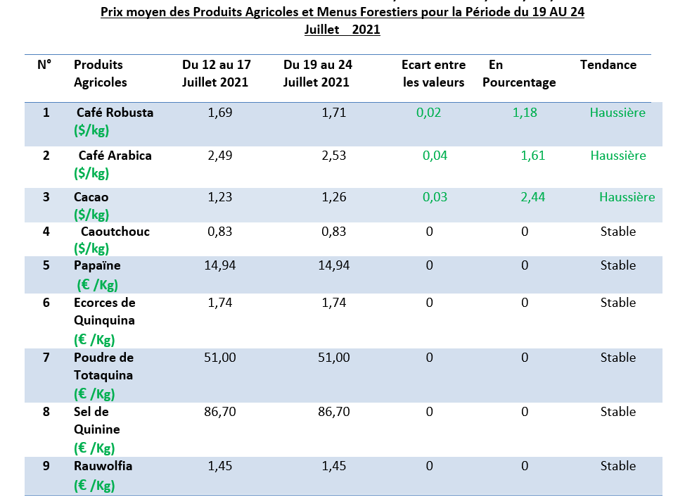 Tous les autres menus forestiers affichent une tendance stable des prix, notamment le Rauwolfia, le sel de quinine, la poudre de Totaquina, les écorces de quinquina.