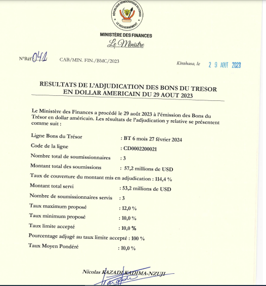 Les Bons du Trésor en dollars américains lancés le mardi 29 août 2023 ont rapporté 53,2 millions USD sur le 50 millions USD visés, soit un taux de couverture du montant mis en adjudication de 114% puisque les soumissions ont atteint 57,2 millions USD, renseigne un communiqué du ministère des Finances.