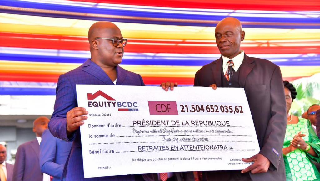 Le Chef de l'État leur a remis un chèque symbolique de plus de 21 milliards de Francs congolais. Dans le même cadre, Mme Claudine Ndusi, ministre de l'Emploi, du Travail et de la Prévoyance sociale, a également remis, en faveur des retraités, un chèque symbolique de 2 millions de dollars américains au Directeur général de la Caisse nationale de sécurité sociale (CNSS).